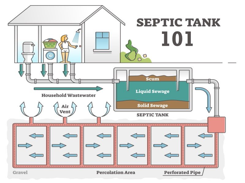- Septic Tank (Primary Treatment): Wastewater flows into the septic tank. Solids separate from liquids: heavy solids sink to form sludge, and lighter materials form a scum layer on top. Anaerobic bacteria begin to break down organic matter.